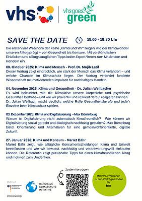 In der Webinar-Reihe zeigen wir, wie der Klimawandel unseren Alltag prägt – von Gesundheit bis Konsum, von Mobilität bis Digitalisierung. Mit verständlichen Einblicken und alltagstauglichen Tipps laden wir alle Interessierten zum Mitdenken und Handeln ein.