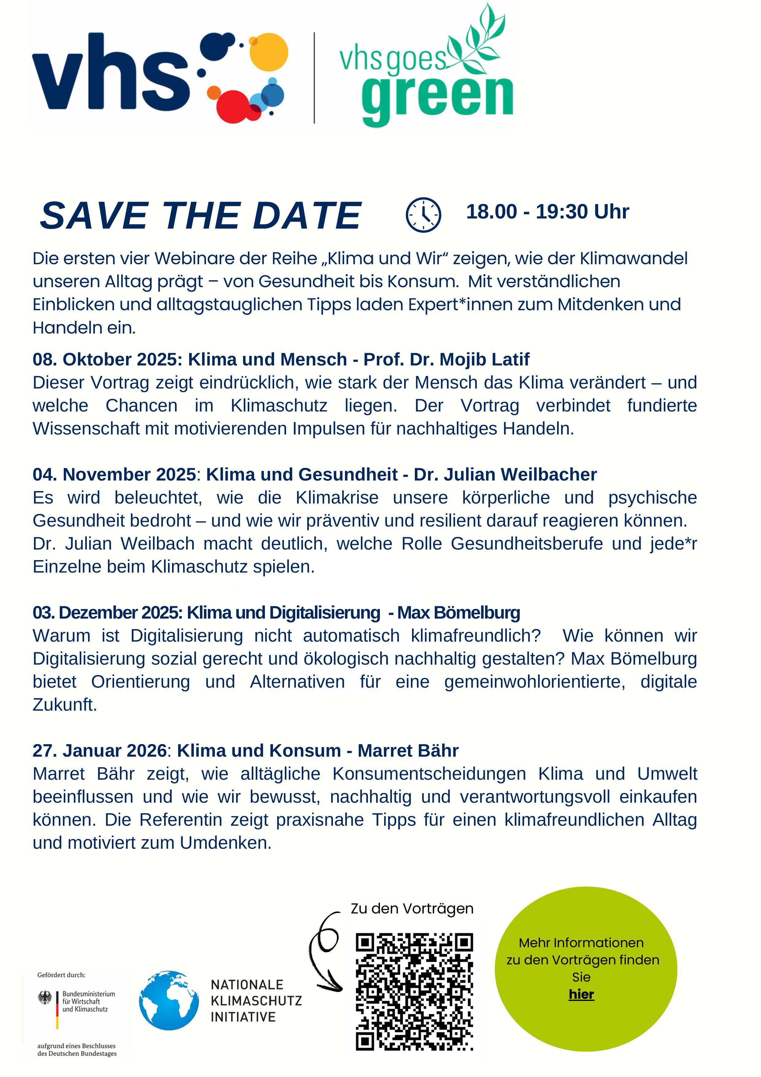 Die Veranstaltungsreihe ist Teil des Projekts „vhs goes green 2“ und wird gefördert vom Bundesministerium für Wirtschaft und Klima, im Rahmen der Nationalen Klimaschutzinitiative. Weitere Informationen zur Webinar-Reihe finden Sie hier.